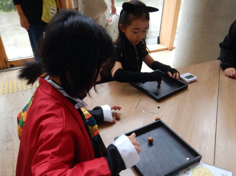 紙芝居でお馴染みの「びっくりばこ」(ありまふじ夢プログラム)さんによる公園のどんぐりを使ったどんぐりゴマづくりのプログラム。好きなもようをつけて、MYどんぐりゴマを作って回して遊びました。