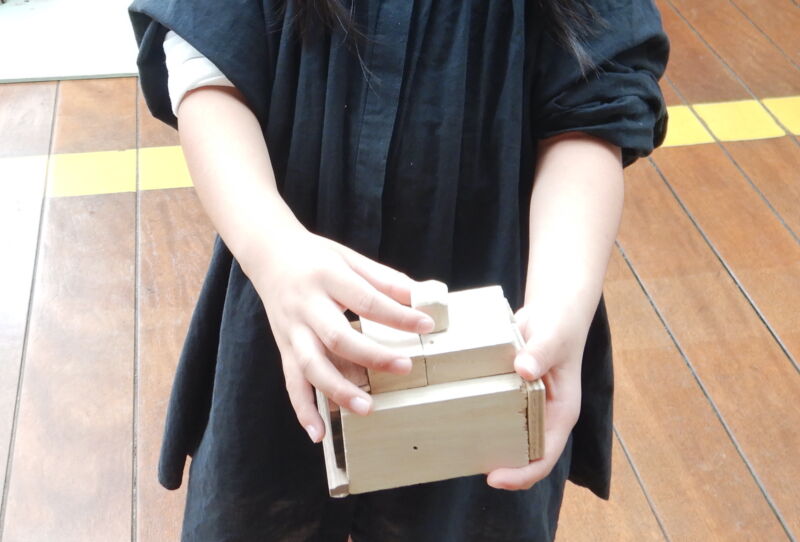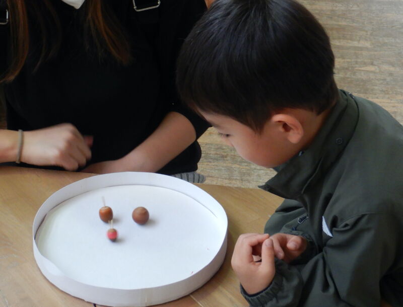雨のため室内実施になり残念でしたが、ラボ特製のどんぐりころがし台をたくさんご用意しました。