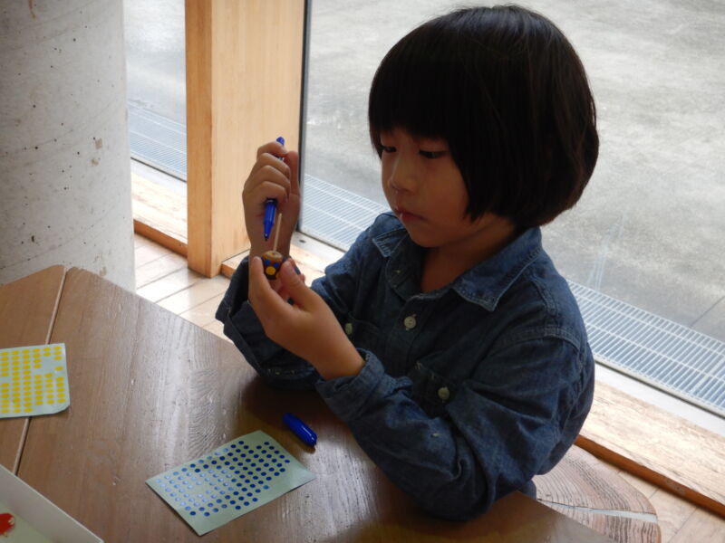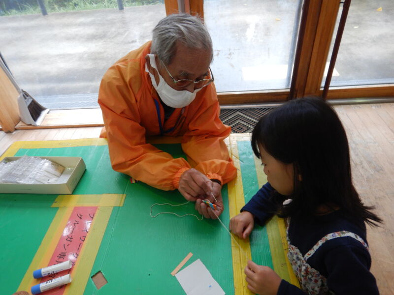 「フレンズスリー」(ありまふじ夢プログラム)さんによるプログラム。ブンブンゴマや昆虫の折り紙など、自分で選んでスタッフの方と一緒に作りました。