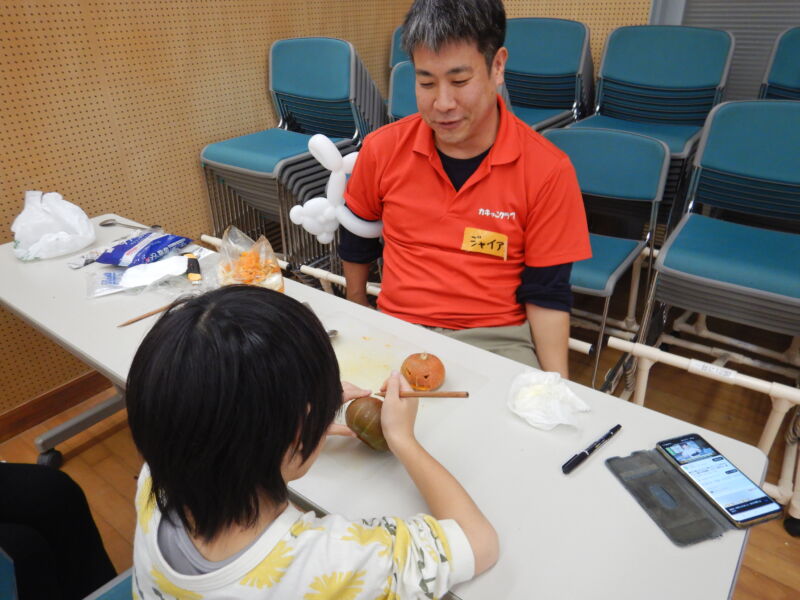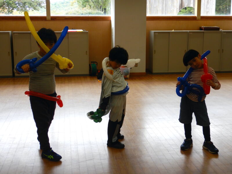 「ガキっこクラブ」(ありまふじ夢プログラム)さんによるプログラム。工作やバルーンアートなど好きな遊びを選んでプレーリーダーと遊びました。