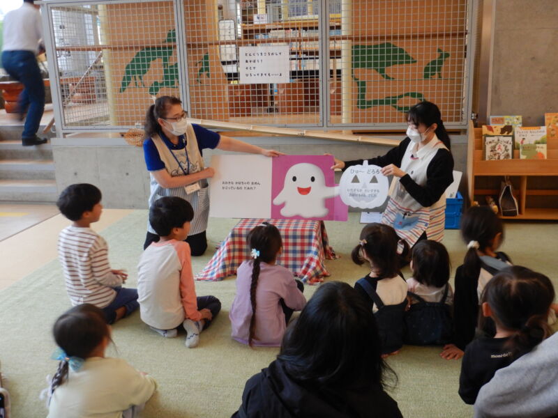 三田市立図書館より移動図書館車「ひまわり号」にたくさんの本を載せて来てくださいました!大きな絵本の楽しいおはなしにみんな集中して聞き入っていました。