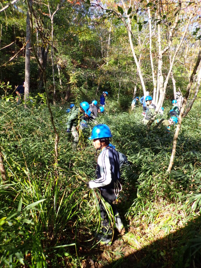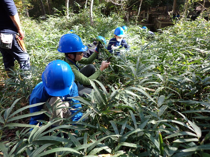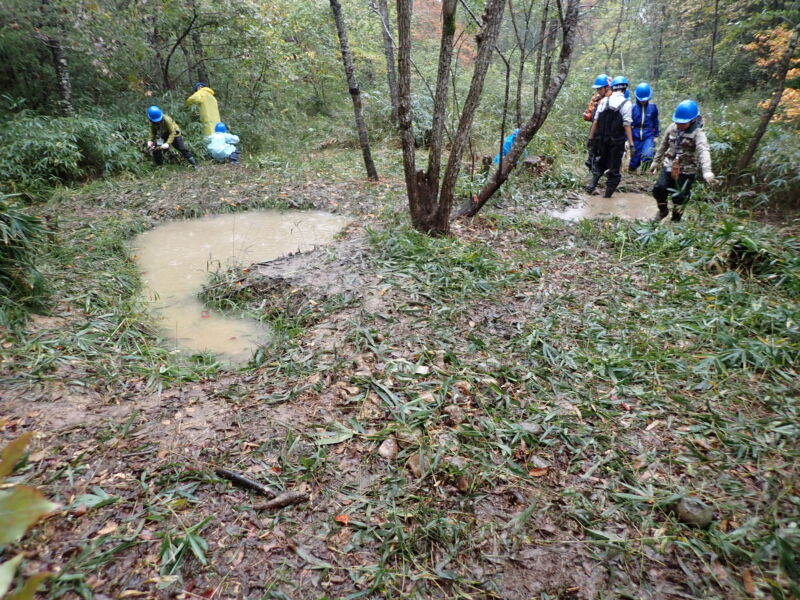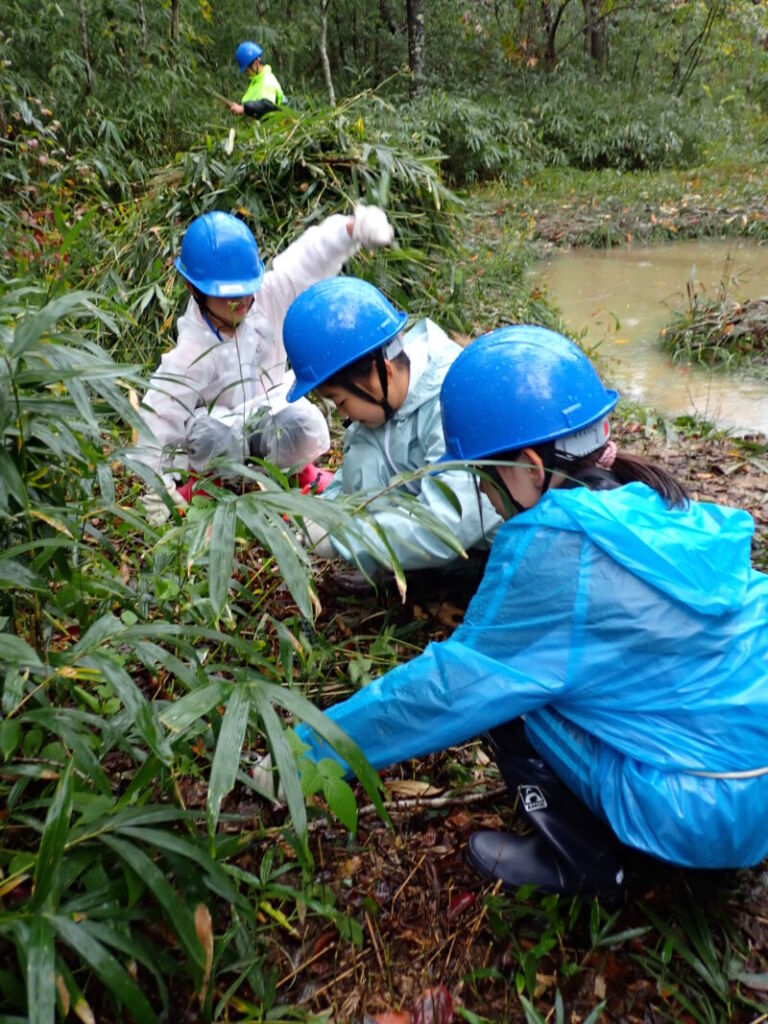 有馬富士公園内の湿地が笹や低木に覆われてきているため、それらを刈り取り、明るい空間を作り出すとともに少し穴を掘って湿地を再生するという作業を行います。森を明るくすることで日向を好む植物が新たに育つことができます。また、広い湿地を作ることでカエル、トンボのヤゴ、ミズカマキリ、ゲンゴロウ類など新たな小動物がやってきます。さらに鳥やけものが水を飲みに来たり、水浴びすることもできます。