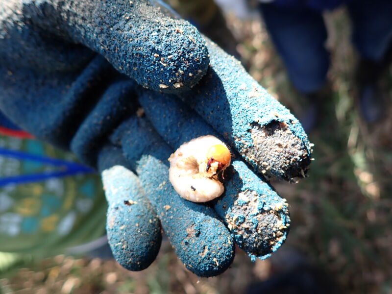 作業の合間にクワガタ幼虫やカマキリの卵塊なども見つかり、その時は手を休めて観察します。