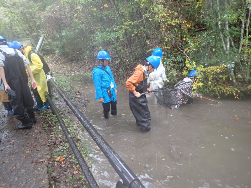 翌日9日(日)は朝から大雨。ですが活動は中止にせず、可能な限り実施しました。まずは小さな池でアメリカザリガニを捕獲します。この池では毎年カエル類が卵をうむので、ザリガニはその天敵です。