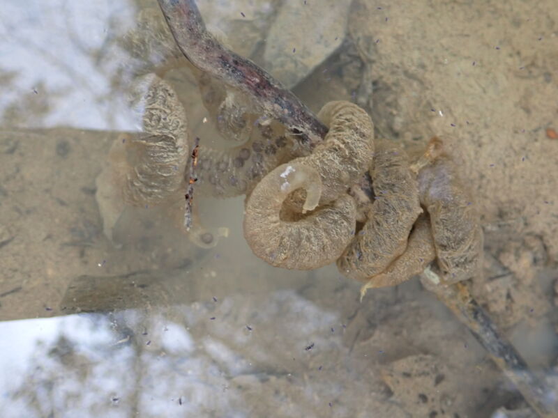 それでも、少ない水たまりにはいつもと同じようにセトウチサンショウウオが産卵していました。クロワッサン状の卵のう(卵のはいったふくろ)に100くらいの卵が入っています