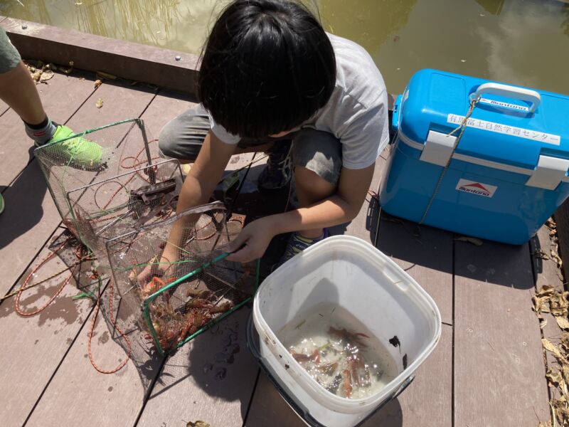 水辺の生態園のかいぼりとザリガニ捕獲装置をつくります